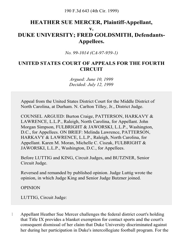 Appellant heather sue mercer challenges the federal district court's holding that title ix provides a blanket exemption for contact sports and the court's consequent dismissal of her claim that duke university discriminated against her during her participation in duke's intercollegiate football program.